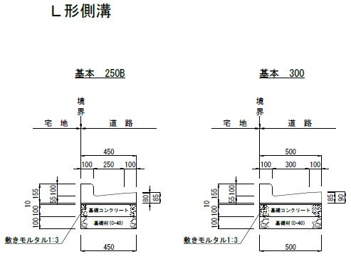 U形・L形側溝 L形側溝(JIS規格品) |  | ![]() | 断面図(参考資料) | カタログPDF 図面データ 図面データ2 |